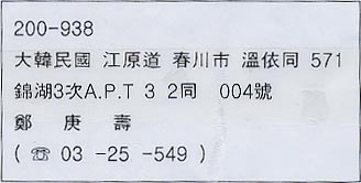 先日なにげなくテレビを見ていたら「食わず嫌い王選手権」だったっけ?とんねるずの番組にチェ・ジウとスマップのゴローちゃんが出ていた。チェ・ジウのメニューを見て何が嫌いか瞬時にわかった。たぶん韓国に住んでいる日本人なら誰でもわかるだろう。彼女の嫌いなもの(あるいは食べたくもないもの)は“焼き塩ジャケ”だったからだ。韓国で塩鮭を食べる習慣はない。どうしても食べたくなった在韓日本人は日本から持って帰る。魚はおもに白身の魚が好まれる。日本食が普及して寿司なども食べられるようになったので「マグロ」を食べることも増えたけれど、基本的に赤い魚は食べない。そんなようなことは、いろんな「本」で知っていた。チェ・ジウはこんなことも言っていた。・日本での撮影でお弁当が出る。そこに“冷たい焼鮭”が入っている。あれもいやだ。・オレンジの魚なんて食べたくない。ほらね。やっぱりそうだ。韓国って熱々のごはん・おかずが好きだものね。ロケ弁なんてきっと囚人の喰い物ぐらいにしか思えないだろうな。だけどチェ・ジウ。そんなにまずそうに喰わなくったって。。^^さて先月、春川のジェミン(小学生)とジェウ(高校生)あてに、仮面ライダーとガンダムのフィギュアを送ったと日記に書いた。ふたりの進級のシャレのつもりだった。高いもんじゃないしね。さすがに高校生のジェウはおもちゃをジェミンに譲ったようだ。そんなメールも来た。メールの終わりに、「韓国海苔」送ったよとあったので、わざわざ気を使わなくてもいいのに。。。なんて思ってたら、いきなりメールが届いたきのうEMSで届いた。しかも大型小包み。20袋も入っていたよー!!韓国人はそんなに“律義”じゃない^^と思ったから気楽に送ったのに。これじゃ逆だ。驚いたのはもうひとつ。送り手の住所が印字されていた。しかも漢字。こりゃほんとに韓国人が漢字忘れるわけだね。ギョンス父さんの漢字フルネームもはじめて見ました。むずかしすぎるって。