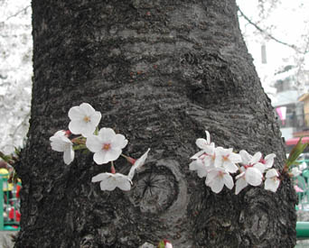 桜前線は北上する。私たち夫婦はきのう桜前線をつぼみの町から満開の町へと南下した。先日の日記で書いた「熟年離婚」してしまったM子ちゃんに会いに東京へ行ったのだ。私はただの運転手役。妻が彼女の話しを聞いてあげるというかたちでおじゃました。5年ぶりに会うM子ちゃんは元気だったが、築40年ぐらいの二間しかない文化住宅は今にも風で飛ばされそうなさみしい住まいだった。ふたりは話しがあるだろうからと、私は早々に近所の散策にでかけた。ここは完全な下町。町を流れる川の両側に桜並木が続き、いままさに桜まつりの真っ最中だった。川の両側ではミニバザーや花屋がでて賑わっている。この写真の桜の木の下では黒人の双子の姉妹が日本語で「買ってくださーい!買ってくださーい!」なんて叫んでいる。下町なので人種もさまざまな様子だった。川を渡す歩道にたつと春満開である。こんな風景が数キロ続く。私はヒマなのでのんびり歩くことにした。並木のなかほどが賑やかなので覗いてみると、「子ども太鼓」のアトラクションをやっていた。小さな女の子たちが演歌に合わせてドドドン ドドドドンっとリズミカルにバチをあやつっている。見学している人々の顔もおだやかだ。ただ“地味”なその人々の服装を見ていると「平成のいざなぎ景気(バブル)に次ぐ好景気に湧く日本!!」の姿などどこにもなく、日本という国が確実に2局化していることをひしひしと感じる。焼きそばやたこ焼き、お好み焼きやら焼き鳥やら屋台も出て、子どもたちで賑わっていた。川には大きな鯉が泳ぎ、気の早い子どもたちが網をもって追いかけている。どっぷりニッポンの原風景に出会った気がした。きのうはM子ちゃんの4人の男の子たちのうち3人とも会えた。私が肩車をしたり、キャンプに連れていった子どもたちもすっかり大きくなっていた。子ども会いたさにM子ちゃんもこの下町を離れられないらしい。新しいお母さんがやってくるだろうという話しも聞いた。M子ちゃんと妻は「ほんとに夫婦ってただの他人だねー」と笑いあったらしい。お米と梅干しを置いて、私たちはつぼみの町へと帰ってきた。