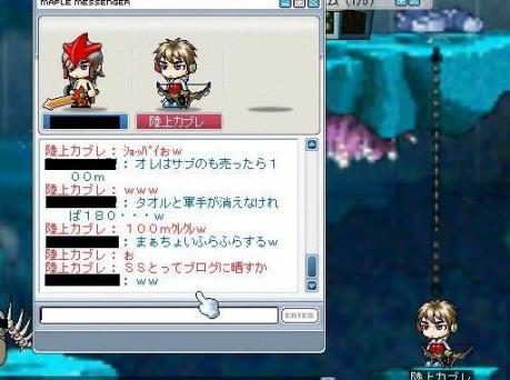 今日もメイプルストーリーを楽しくプレイ♪といっても友達の少ない私は普段、メイプルストーリーにINしてもひたすらモンスターを倒して狩りをするだけ。。 。・゚・(ノ∀`)・゚・。オンラインゲームなのにオフラインゲームのようだ(´・ω・`)ショボーンしかぁし!今日の俺は一味違ったぜ!いつものようにオハゼさんと戯れていると、古い友達がめずらしくINしてきましたw久しぶりに話しましたw受験勉強は大丈夫なのか心配です(・∀・;) 彼は、ふらふらすると言ってどこかへ行ってしまいました(´・ω・`)/~~また孤独にオハゼさん達と戯れていると今度は、最近よくお話をしてくださる方が直に会いに来てくださいましたwブレイスさんは、たまに会いに来てくださる数少ない友達的存在です。金銭感覚がオカシかったり、自殺する癖があったりするお方です。主食はバブリンのようですです。 その後、特に意味のないような雑談をさせてもらいましたw楽しかったです(・∀・)♪なにやら、お怒りのご様子・・・怖や怖や。。 いつもなら、INしている大半の時間が狩りをしている時間なのですが、今日はチャットばかりしていました。やっぱりチャットするのは楽しいですねというわけで、今日はあまり狩りをしなかったので経験値もあまり上がりませんでした→→→→→→→→最近、狩る気力が低下していて困っています・・・どなたか秘策を教えてください><ドロップはこれだけでました~イベントガイドさんに献上しようとしましたが受け取ってくださいませんでした。嫌われているのだろうか・・・・ では、今日はこのへんで終わることにします。(=゚ω゚)ノジャ、マタ!!