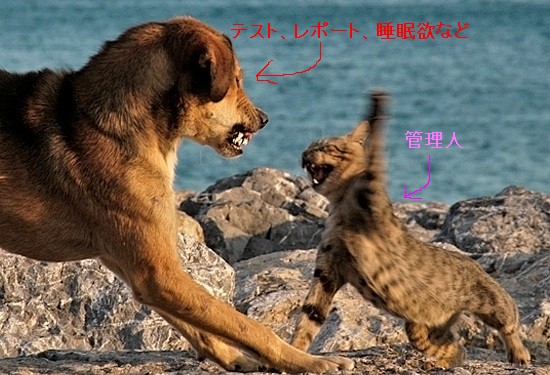 昨日、無理してメイプルやったのが悪かったのか完全に風邪をひいてしまいました。どうみても学校休みました。本当にありがとうございました。誰かヒーリングβ使ってくr今は、昼食を食べに起きてきたところです。あわよくば午後からでも学校行こうと思っていたんですが、まだムリっぽいですね。甘かったです。(´・ω・`)ショボーンでもまぁ、テスト期間中じゃなくて良かったです。今の時期は季節の変わり目で風邪をひきやすいと思いますので皆さんは管理人のようにならないように気をつけて生活してくださいね。(=゚ω゚)ノジャ、マタ!!現在の管理人の心情を表した、ぬこ画像を貼っておきまする。↓↓↓↓↓↓↓↓↓↓