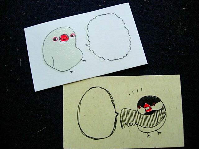 先日入稿したのが届きました! 名刺サイズのメッセージカード。 黒い部分はツヤツヤしてます。 白い部分がツヤツヤ……というか、ブツブツしています! そしてなぜ私の文鳥はあくどい顔になるのか……。 文鳥まつりとオンラインショップ「鳥とりトリ」やコミティア106で販売予定です。 このキャラでぽち袋も予定しています。