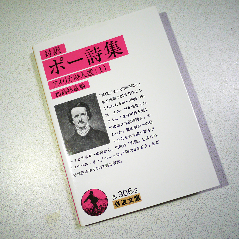 アポリネールの次はポーです。「大鴉」が読みたくて買いました。何を話しかけても「never more」しか答えない大鴉が登場する物語詩です。やっぱり「大鴉」が一番好きな詩ですね。大鴉と出会い、次第に主人公が破滅していく心情を詩の形にしています。もしかしたら、ポーの短編小説よりも、美しい作品かな~とさえ思ってしまいます。しばらく「never more」が頭から離れなくなります(笑)この現象は去年、「スペードの女王」を読んだ後、しばらく「トロイカ、セミョルカ、ダーマ」が頭から離れなくなる現象と一緒ですね(笑)他にも「鐘のさまざま」や「アナベル・リー」とか有名な詩も入ってます。「鐘のさまざま」は原文を口に出して読むと、さらに良さがわかる感じです。リズム感が心地いい感じ。ただ、やっぱり私は基本的に英語がわからない人間なので、物語詩が一番とっつきやすいですね。この岩波の本は原詩と対訳がのっているので、ないよりはニュアンスが伝わります。いくらかは。