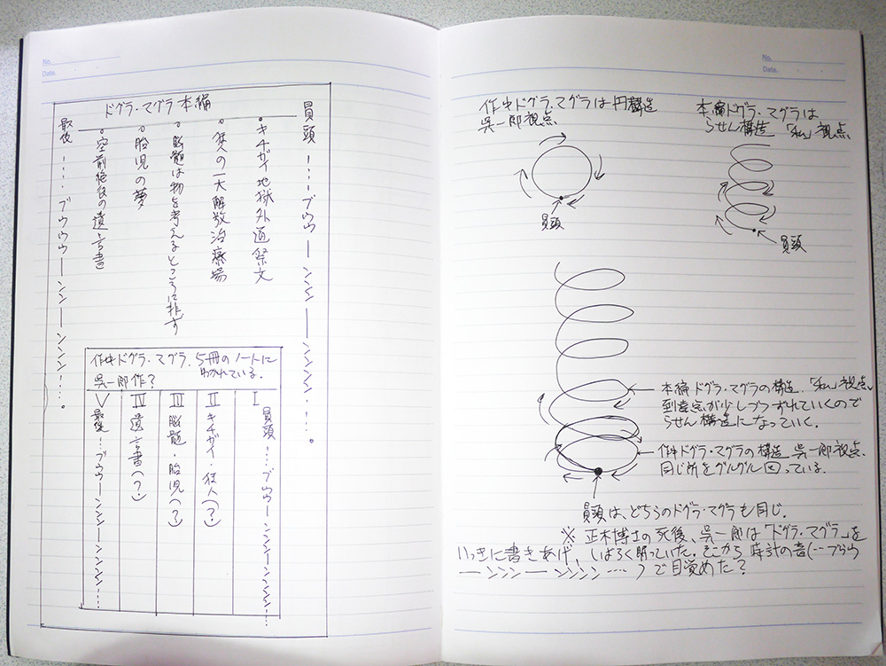前回は「ドグラ・マグラ」を時系列で図解しましたが、今回は構造を図解してみました。冒頭と最後の時計の音がカギになると思います。御覧のように「ドグラ・マグラ本編」と「作中ドグラ・マグラ」で比べてみます。「本編」では冒頭と最後の時計の音が微妙に違いますね。しかし「作中」では全く同じ音です。これはどういうことかというと「作中」の方は円構造になっていて、同じところをぐるぐる回っている、ということです。「本編」は微妙にずれたところに着地しているので、らせん構造をかいています。「作中」はおそらく呉一郎が書いたものなので、呉一郎の視点になっていると思われます。「本編」は「私」視点です。おそらくですが、今後も少しづつ着地点を変えながら、様々な視点で先祖たちの悪夢を見ることになるのか・・・・・(汗)これに気が付いた時、やっぱり「呉一郎」と「私」は別人だなあと思いました。まあここまでなんですけどね、わかったのは。これ以上考えると私まで堂々巡りのドグラ・マグラに巻き込まれそうなのでこんなところでやめておきます(笑)まだまだいろんな謎が隠れているような気がします。