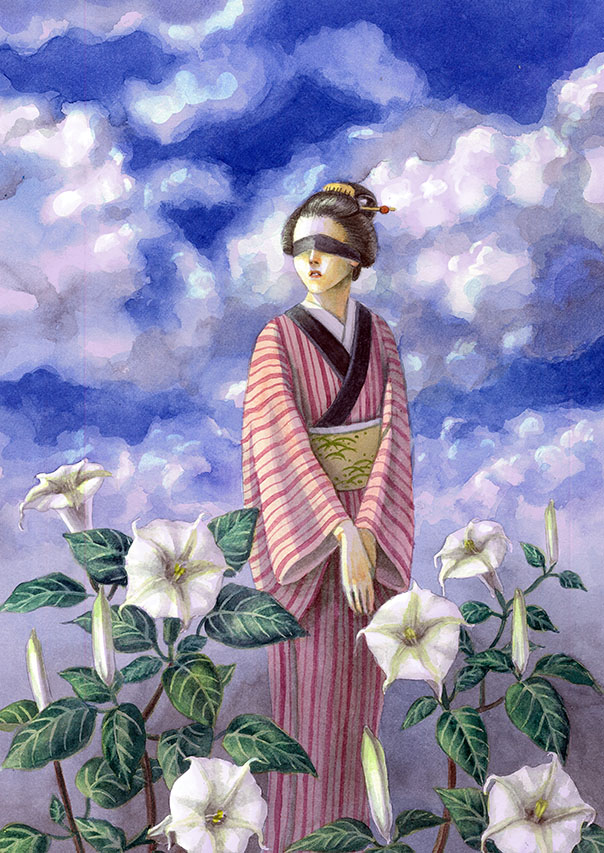 小説一冊読んだらそれにまつわる絵を描く、ということを決めてるわけでもないんだけど、ここまでやってやっと自分の中で消化したような気がします。これは先日読んだ「華岡青洲の妻」ですね。一番描きたかったのはチョウセンアサガオの美しさと、もう二度とみられない青い空ですね。透明水彩で描いてから、それをスキャンしてパソに取り込み、一枚レイヤーを足してます。
