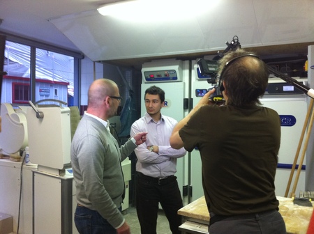 3日前くらいから突然のコンタクトで、Arte アーテ(France5,7)のドキュメント番組の撮影が入った。今回のテーマは、フランス、フランス人の血であるフランス食文化の昔~今。フランス人のアイデンティティとも言えるパンが、遥かな歴史を超えて今どう変化(進化)しようとしているのか???取材班は5名。音声、証明、デレクター兼監督。そしてプレゼンテーター。まずは、パンの厨房からの撮影。たまたま日本から来ていた研修生の方も、映像としてフランスに足跡を残す事になってしまった。(大喜び??)その後、地下のラボへ。。。今月のお菓子ガレットについて、アーモンドとボードレーズの違いについて解説。そして、フェーブの由来についてを話す。クルーはお店へと上がり、製品の前でコメント。そして、お店の外から中に入って来るところを撮影。トータル2時間半に及ぶ撮影は無事終了。このドキュメンターリーは編集され、Arteに出され、放映が決まるそうである。これまでも色んな取材がやって来たが、本格的ドキュメンタリーは初めて。どんな番組に仕上がるのか???とても楽しみだ。パンとお菓子の教室Ecole Levain D'antanhttp://ecole.landemaine.me/