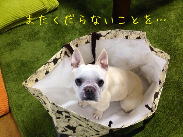 紙袋の中のプー、っといっても、 犬が自分から紙袋の中に入るわけもなく、 こんなくだらないことをするのは勿論、 娘。 そして、それを写真に撮る母、 は私。 もしかしたらバカ親子? 紙袋の中に入れられたプーが、 バカにしたような目で見ているように 見えるのは、気のせい?