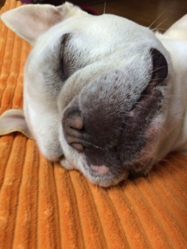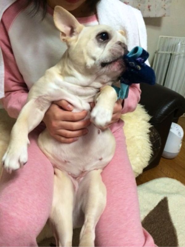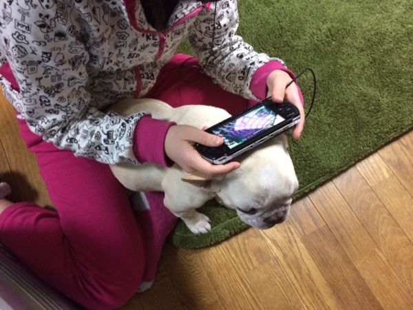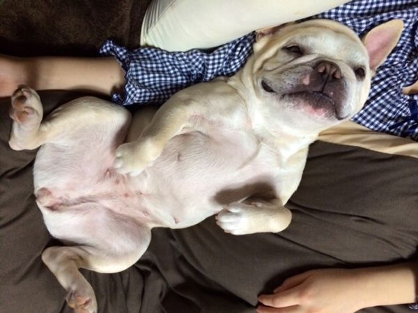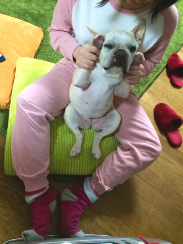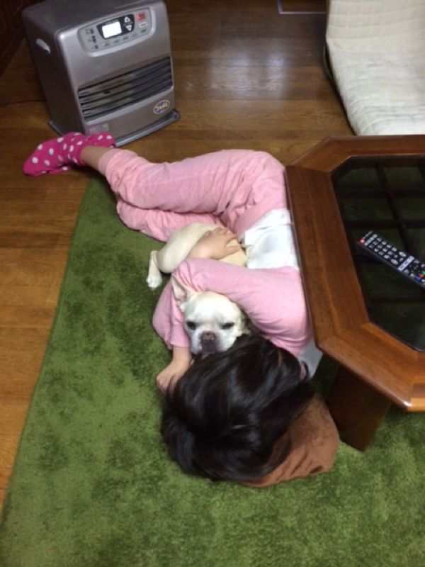 娘の腕枕でくつろぐプー 犬か? それでホントに犬なのか?