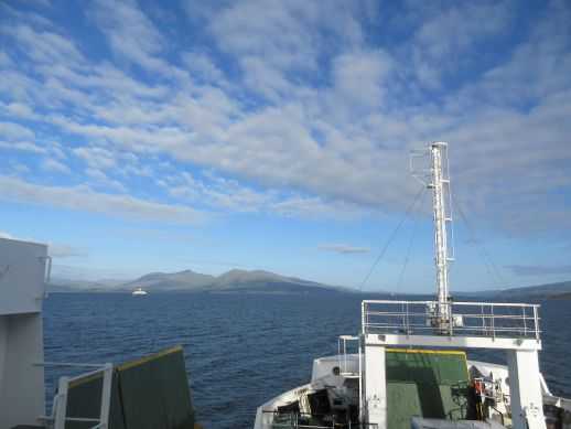 やがて前方にアイラ島も見えてきました。進行方向右手には、ジュラ島の山々が見えます。そしてこちらは・・・アイラ島の山ですね。左手に見えます。遠くには帆船が見えます。なんとも大らかで、ゆったりとした風景です。船は右手にジュラ島、左手にアイラ島を見ながら進みます。写真の左がアイラ島で、右がジュラ島ですね。船はこの二つの島に挟まれたアイラ海峡(Sound of Islay)を通って、アイラ島のアスケイグ港(Port Askaig)に向かいました。(続く)