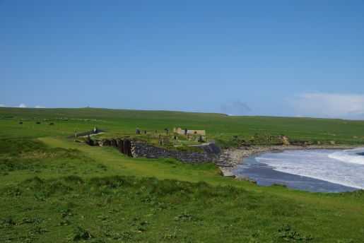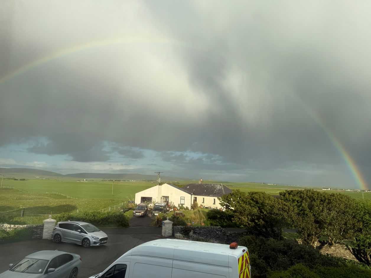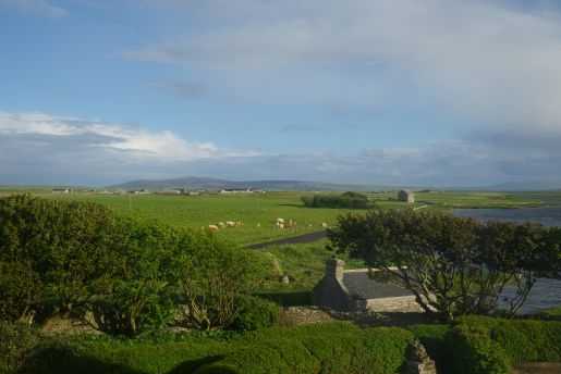 虹が出た頃から天気は好転。美しい田舎の風景が見渡せます。そして翌27日も快晴。午前9時ごろのホテルからの風景です。遠く左奥の地平線にはモイ島の山々が見えていますね。手前の湖は、ハレイ湖(Loch of Harray)です。そしてこの日午前に向かったのは、スカラブレイ(Skara Brae)です。なんと今から6000年以上前の居住跡がここにあります。午前9時半開館。ちょっと早く着きすぎてしまったため、風の吹く中、15分ほど待たなければなりませんでした。(続く)