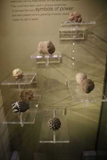 メイズハウの遺跡見学は、最初は遺物の展示や紹介ビデオではじまります。このような幾何学的かつシンボル的な石製品がたくさん見つかっています。特にスコットランド全域で同様な石製品が使われていたことがわかっています。祭祀などに使われたのでしょうか。展示館の外に出ると、復元された6000年前の住居が現れます。中に入ると・・・当時の生活がしのばれるような展示になっていますね。明かり窓も付いています。これらは復元された住居ですが、本物の住居跡はここから少し離れたところにあります。この道の先ですね。そちらに行ってみましょう。(続く)