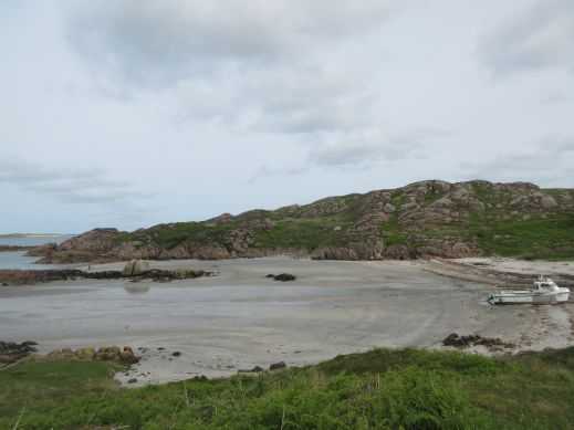 「マル島の一刀石」は、ファイオンフォートの入江の中にあります。上の写真の真ん中左にあるのが「マル島の一刀石」。満潮になると、海の中だということがわかりますね。そのファイオンフォート(Fionnphort)はマル島でも人気の場所です。というのも、ここからフェリーが出ていて、目と鼻の先にある隣のアイオナ(Iona)島に行くことができるからです。また、ここからはパフィンの住む海鳥の島や柱状節理の島で有名な「フィンガルの洞窟」をめぐる島めぐりツアーも出ています。前回、マル島に滞在したときは、二日目はこの島めぐりツアーに参加しました。観光バスの向こうに見えるのがアイオナ島ですね。アイオナ島。今回は渡しませんでしたが、次に来た時にはアイオナ島に渡ろうと思っています。(続く)