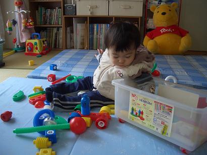 ちび太くんのブロックの遊び方(^^)b ↓↓↓ とりあえず、箱からブロックを出して~・・・ ↓↓↓ ↓↓↓ まだ入ってるよ~っ♪ ↓↓↓ ↓↓↓ 今日はコレにしよっかな~??? ↓↓↓ …とまぁこんな風に、とりあえず箱からぜ~んぶブロックを出してから気に入ったのをひとつ選んで、もんだり転がしたりしながらしばら~く遊んでます。…で、それは誰が片付けるのかな?ちび太くん…(^щ^;)??? ************************************** そんなちび太くんの今日のごはんは??? 朝 : きんぴら&納豆ごはん … ちび茶碗1ぱい(大根&にんじんのきんぴら) ほうれん草とマカロニのチーズ和え … ちびカップ1ぱい みそ汁(じゃがいも・たまねぎ) … ちびお椀1ぱい みかん … 1コ 牛乳 … ちびコップ1/4ぱい 昼 : 納豆ごはん … ちび茶碗1ぱい ウィンナー・たまねぎ・ピーマンのケチャップ炒め … ちび皿1/2ぱい 煮物 … さつまいも1切れ、にんじん1切れ、大根1切れ、ちくわ1/2切れ ほうれん草とマカロニのチーズ和え … ちびカップ1ぱい みそ汁(じゃがいも・たまねぎ) … ちびお椀1ぱい 牛乳 … ちびコップ少し ↓↓↓ ほぼ完食です(^щ^)b ↓↓↓ おやつ : マリービスケット … 2枚 夕 : 鮭チャーハン(鮭・にんじん・大根) … ちび茶碗1ぱい(+納豆スプーン1ぱい) 煮物 … さつまいも1切れ、にんじん1切れ、大根1切れ、ちくわ1/2切れ 和風スープ(じゃがいも・たまねぎ) … ちびお椀1ぱい ばなな … 1/2本