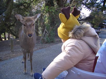 今日はシカを見に、3人で奈良公園に遊びに行ってきました(^^)♪ ↓↓↓ ちび太くんとごた~いめ~ん!!! ↓↓↓ ↓↓↓ どーしよっかな… ↓↓↓ ↓↓↓ えいっ!!! ↓↓↓ ↓↓↓ う~んと… ↓↓↓ ↓↓↓ もっかいさわっちゃえ!!! ↓↓↓ ちび太くんはシカは大丈夫だったみたいで、怖がることなく手を伸ばして遊んでました(^^)b せっかくだから…と、シカせんべいを買って、『シカさんにどーぞは?』とちび太くんに渡したら、なんとちび太くん、シカせんべいを自分で食べちゃいましたっっ(>0<)!!! …確かにちび太くんの大好きなビスケットと同じカタチだったからねぇ…(^^;) なので、シカせんべいはほとんどめめママがシカにあげて遊びました(笑) ************************************** 公園をお散歩しながら東大寺の大仏さんも見に行って、なかなか楽しい休日でした(^^)♪ ↓↓↓ いっぱい歩いてきたよっ!!! ↓↓↓ 奈良まで電車で1時間弱。乗り換えは1回だけ!!! こんなに近いとは思わなかったなぁ~~~(^▽^)♪ また遊びに行きたいなっ♪♪♪