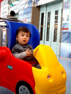 今日は初めて車のカートに乗ってお買い物をしてみました(^^)♪ 『なんだね、これは???』って顔をしながらも楽しかったようで、ずっとおとなし~く乗ってました(^^)bなかなか似合ってるやん!ちび太くんっ(^щ^)♪ ************************************* そんなちび太くんの今日のごはんは??? 朝 : チーズサンドのトースト … 6枚切り食パン2/3枚 和風スープ(じゃがいも・たまねぎ) … ちびお椀1ぱい ばなな … 1/2本 牛乳 … ちびコップ1/3ぱい 昼 : ビー玉おにぎり(昆布&しいたけの佃煮) … 15コ(ちび茶碗1ぱい) ウィンナーとじゃがいものミルクスープ … ちびお椀1ぱい みかん … 2/3コ 牛乳 … ちびコップ少し おやつ : マリービスケット … 2枚 夕 : お寿司 えび … 2カン 納豆の軍艦巻き … 1カン うなぎ … 2カン(ごはんは食べず、ネタだけ(^щ^;)) うどん … 少し ************************************* ちび太くんとの外食は『納豆』がないと、大変なことになります…(笑)