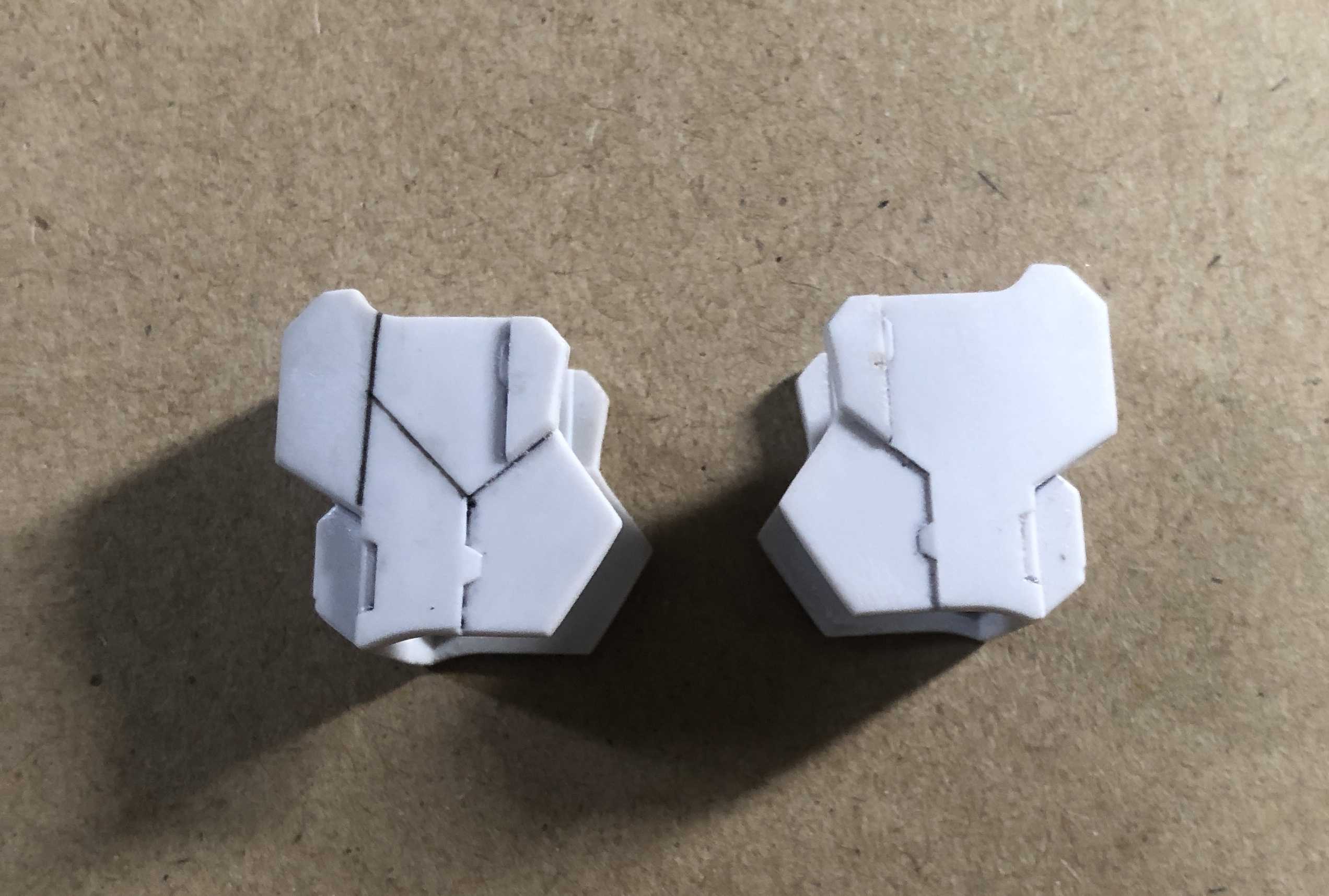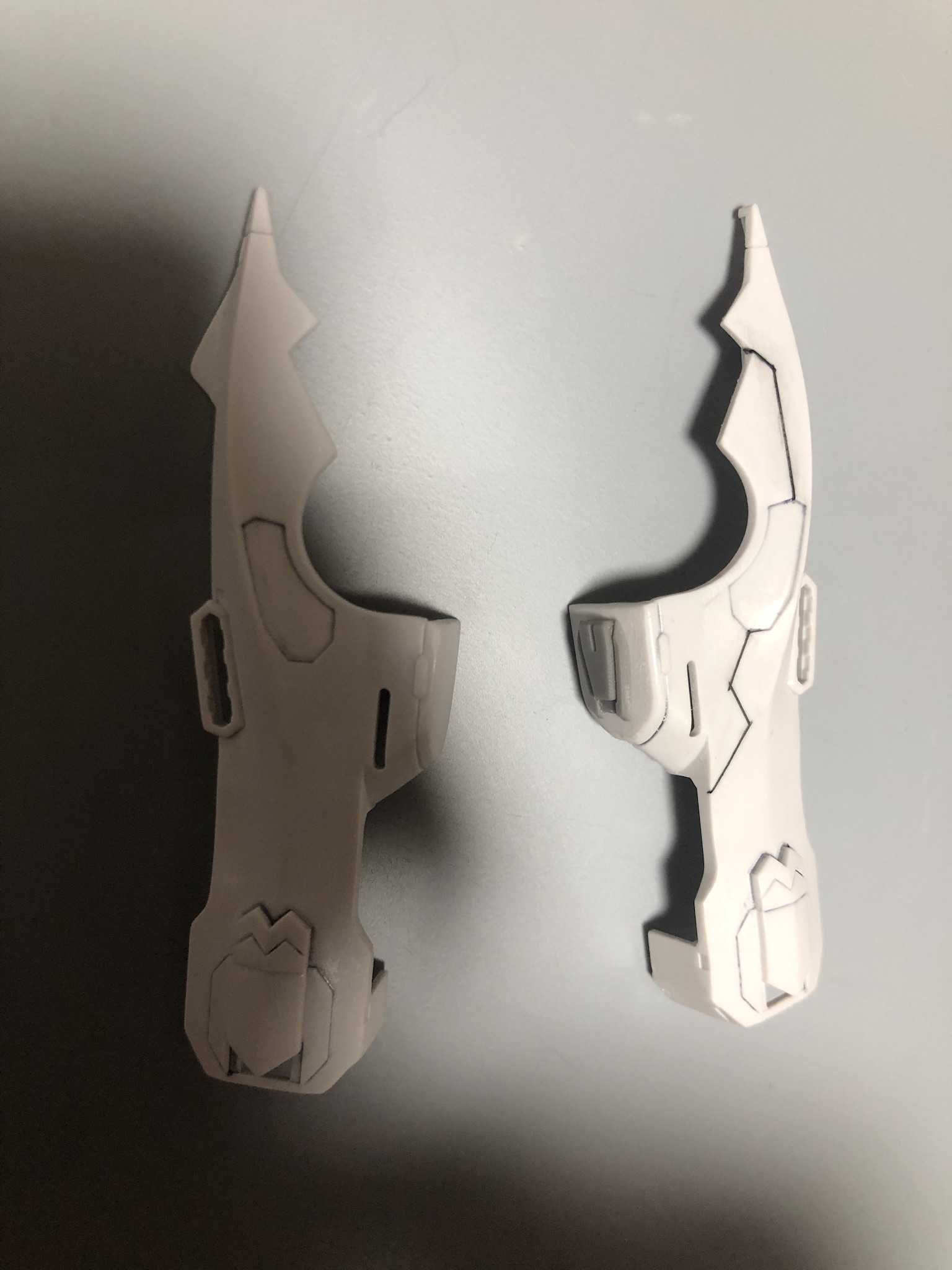 外装、塗り分けようかと思い肩同様にスジボリ追加。以前使わなかったハイニューガンダムのディティールアップパーツがあったのでついでにペタリ。