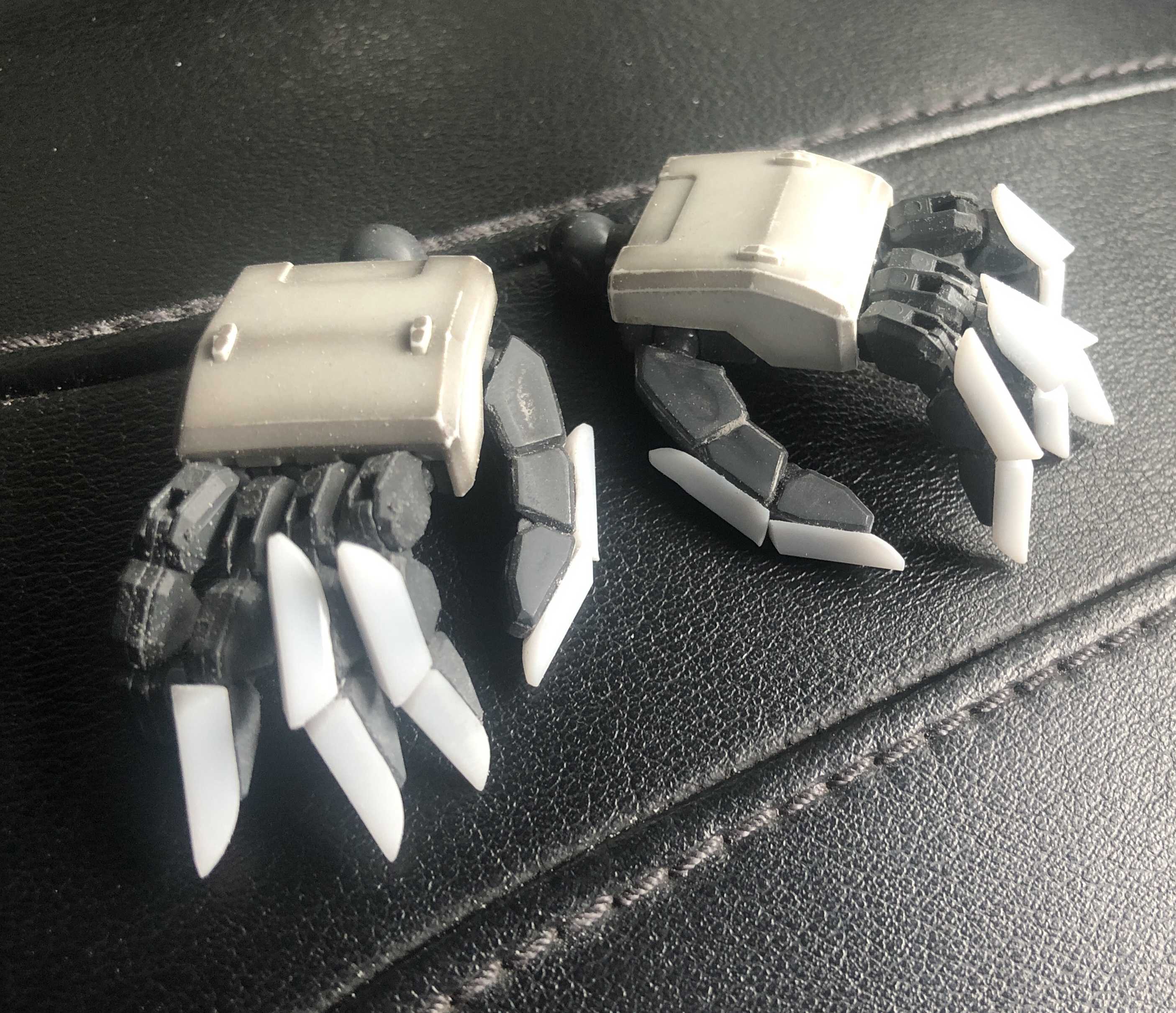 腕は大体出来たので手の改修に入りました。中古でバルバトスを買ったのでハンドパーツが平手しかついてなく握り手を買おうと思ったのですが。。。ネットでたまたま手をPGガンダムのを使用して大きくしている方を発見し、けもの感が増しかっこよかったので・・・パクりました(笑)ただ、PGガンダム系は全て値段が高く、安めのものを探し求めてたどり着いたのが1/60ストライクガンダム(PGではない)でした。それでも3000円近くしましたが手を大きくしたい欲望勝ち😋爪部分は角プラ棒を切り、ヤスリで成形。20本制作です。エッジを意識してひたすらヤスリ(笑)西洋の甲冑を目指してひたすらヤスリ🔪20コつらいっす😫3ミリの三角棒で11ミリの長さで使用しました。全長で約10ミリ長くなり、腰で6ミリ延長したので4ミリ程腕が長くなると思います。一応これで組んで見てバランス悪いようなら腕の付け根位置を上に加工予定です🙋♂️握りもできるーーー微妙な動きの表現もオッケーーー!!これは苦労したけどよかったーーーー