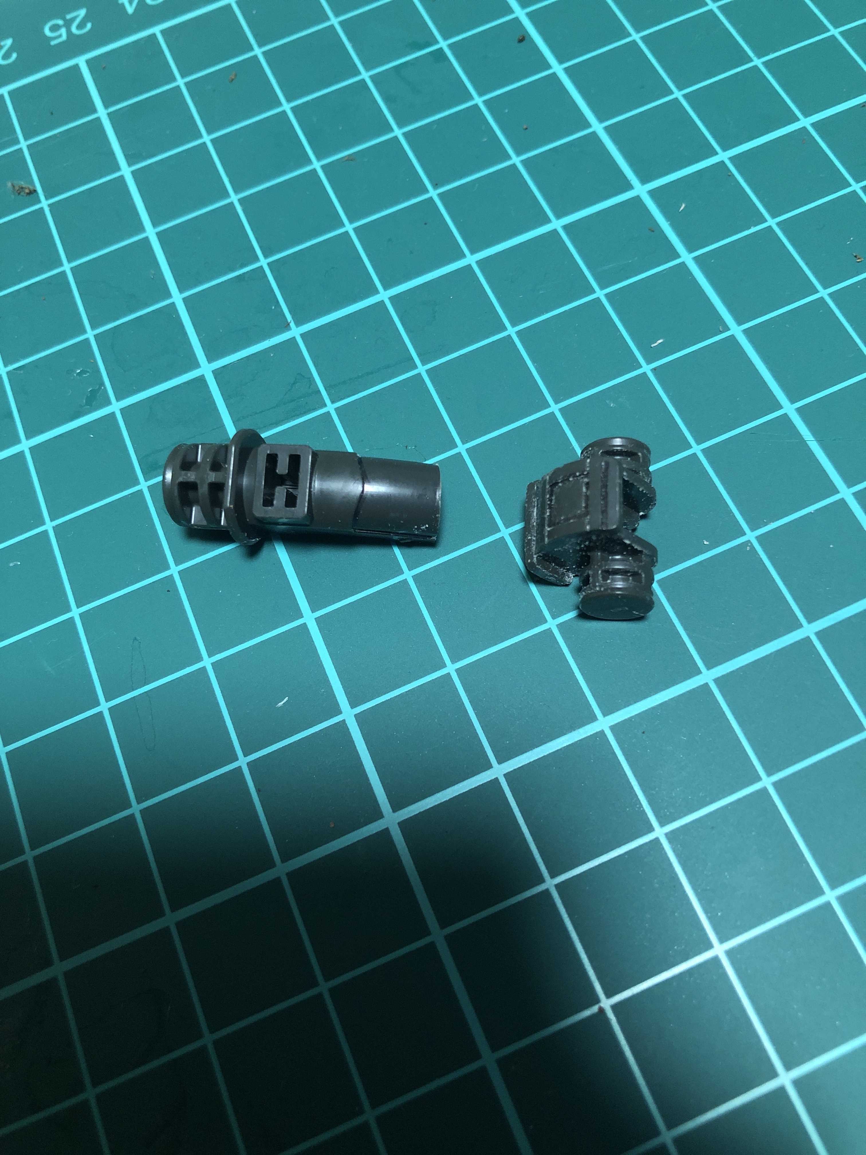 腰を6ミリ、首を2ミリ延長しました。腰を延長した際に左右のダンパーも延長しなくてはならなく丁度あったコトブキヤのサスペンションに交換してみました。これの部品の先端を切り、中央に1ミリの穴をあけて延長です。↑純正ダンパーです。かなり簡素化されていて寂しいし横に突起もあります😔しかも根元の動きが左右一緒に動く作です。交換後はかなりマッチョなダンパーに。根元もボールジョイントに交換したので若干動きが柔軟になりました🙋♂️穴開けすぎて底が貫通(笑)埋めなければ。。。首も2ミリ延長です。