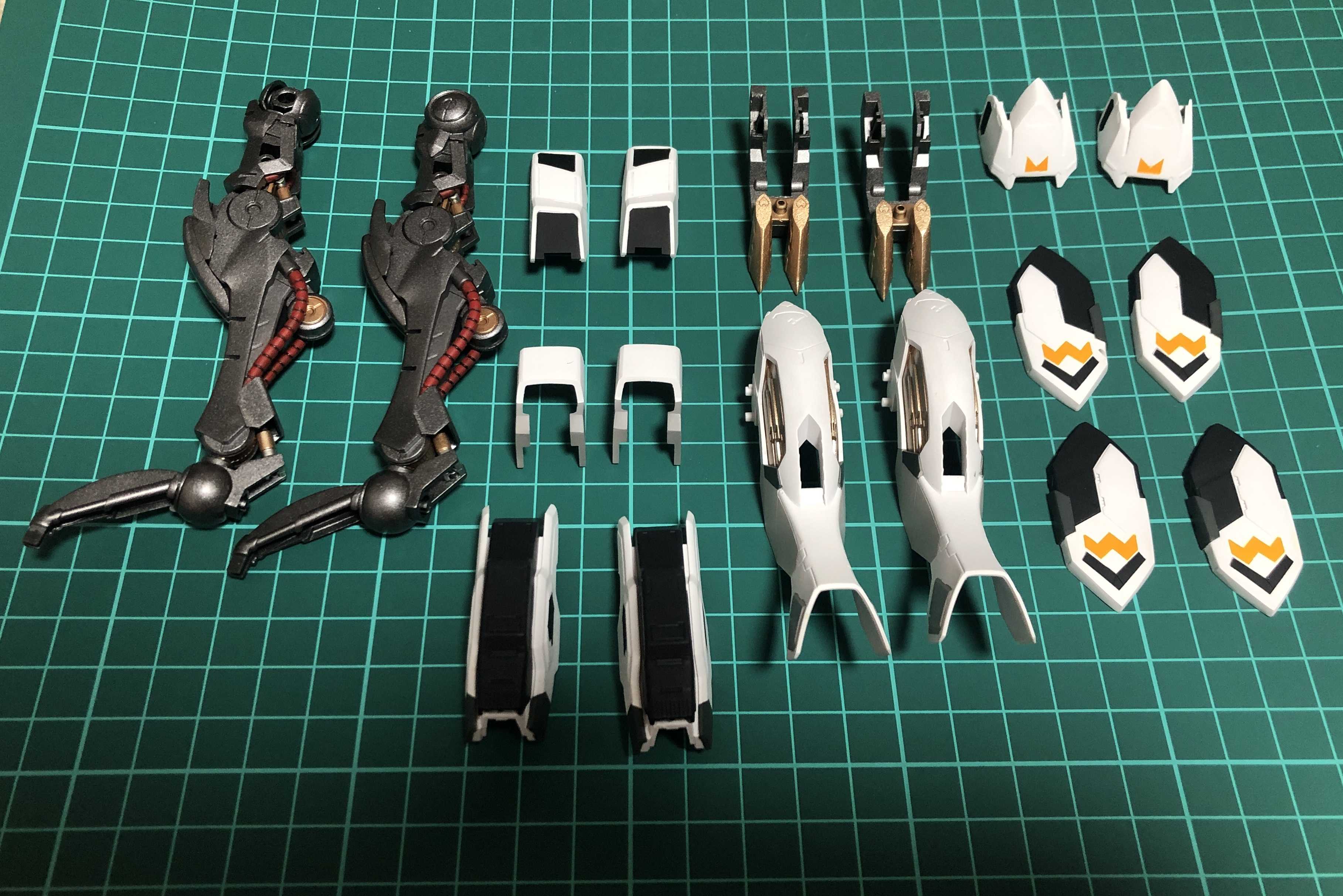 腕フレーム塗り終わりました!シリンダーとパイプは塗り分け。基本ゴールドとシルバーで仕上げました。外装、塗り分けようかと思い肩同様にスジボリ追加。以前使わなかったハイニューガンダムのディティールアップパーツがあったのでついでにペタリ。