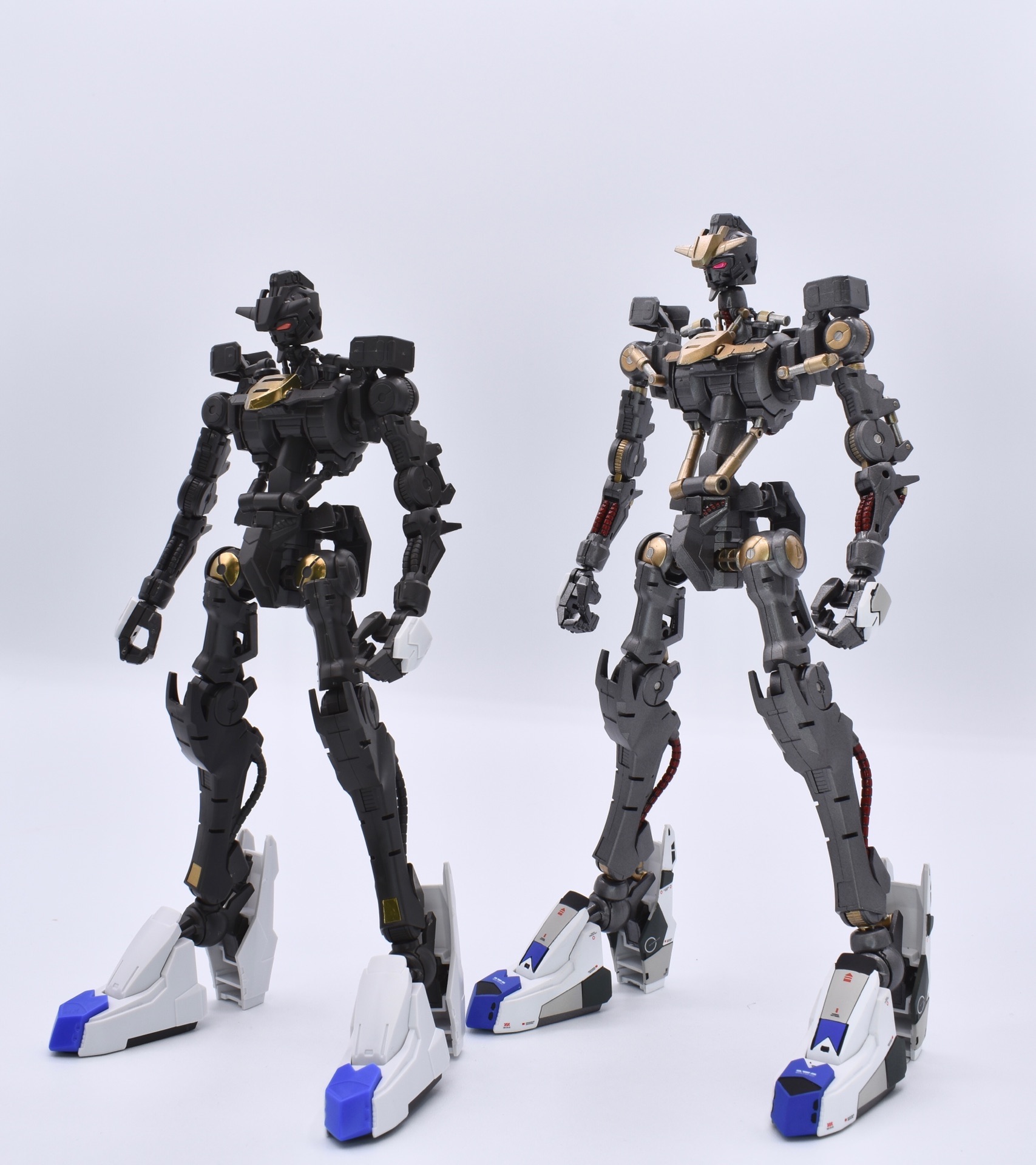 肩の丸部分はゴールドで塗り分け後に中央にマイナスのエッジングパーツを取り付けました。首、肩のシリンダー、頭部の丸部分はエナメルで筆塗りです。パイプは赤で塗り分けました。ノーマルと比較です。首、腰、腕、脚を延長したのでスラッとしたら感じになりました。以前作ったバルバトスルプスレクスと同じくらいのサイズです。クリアでコーティングし、かんせーーーい!