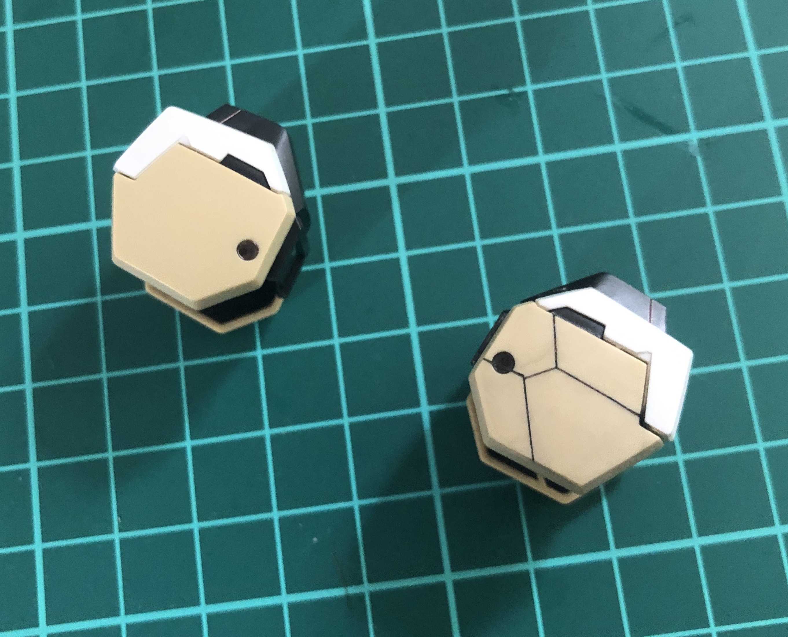 マニピュレーターをつけてみました🙋♂️大きすぎかな?と思いましたが大きくてかっこよーーい!!手首はボールジョイントが大きすぎな為にカットしボールジョイントを交換しました。受け側も丁度よいものをカッターで大きさを調整して交換。幅、厚みは外装つけてないですが大丈夫っぽいです。あまりはみ出るようなら違和感ないように加工しようかと思ったのですがよかったー追加したスジボリから塗り分け。三角部分はアクセントで黄色にしてみました。肩の外装は4色も使ってしまい無駄に時間がかかったのですがホワイトベースみたいになってもーた(笑)中古品なので関節ゆるゆるだったのでアロンアルファで固めに調整しました。あとはハンドパーツかぁ。。。