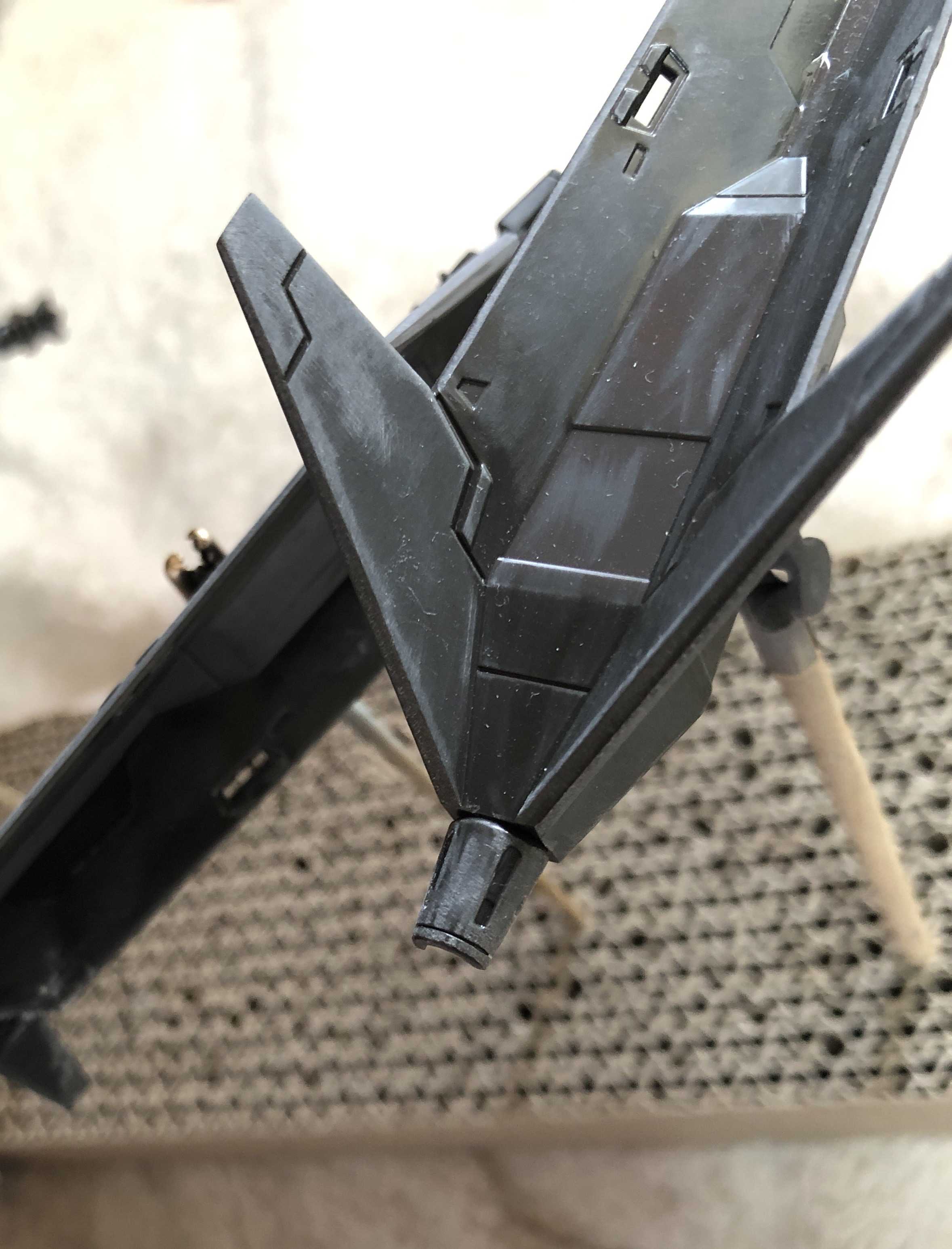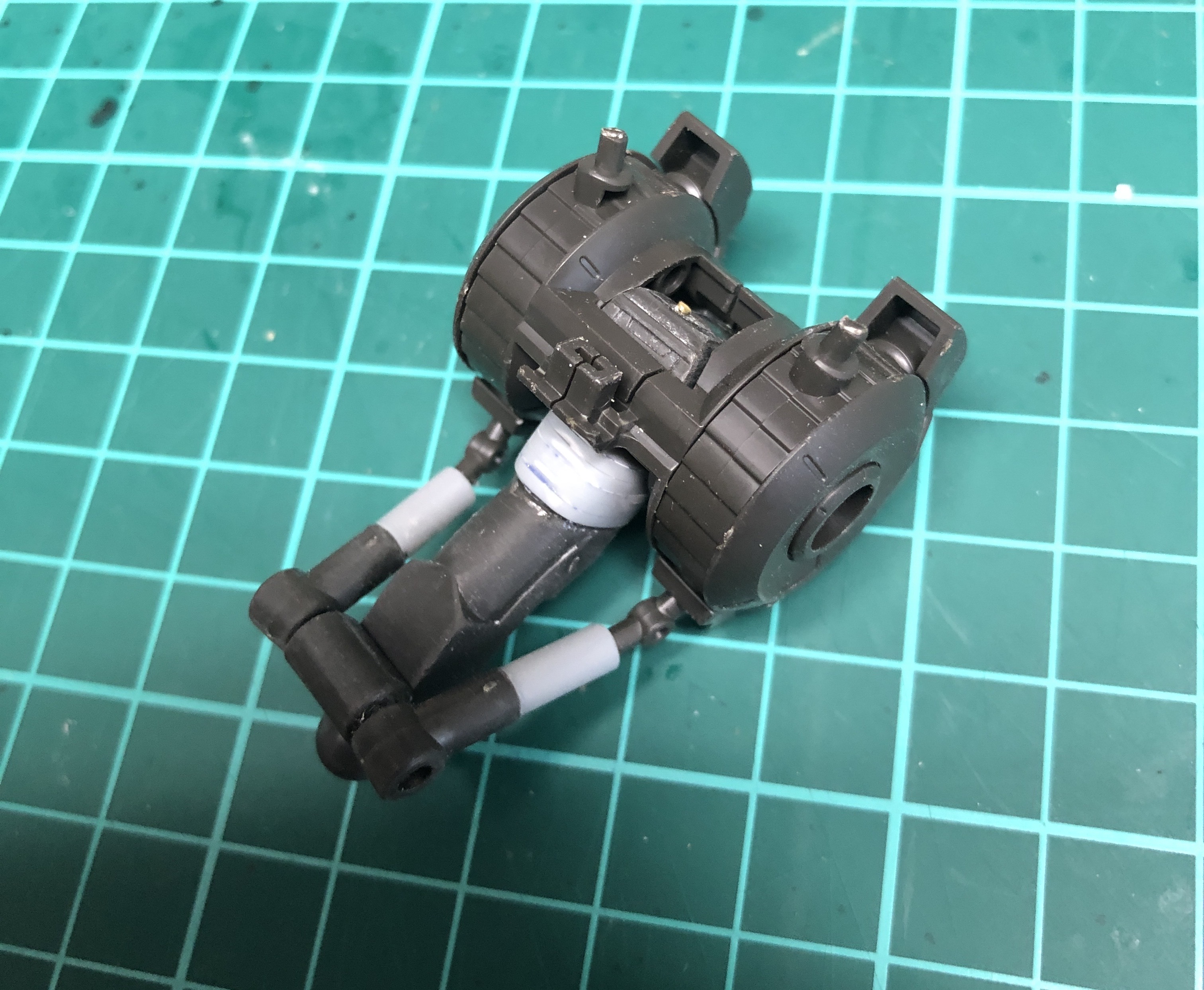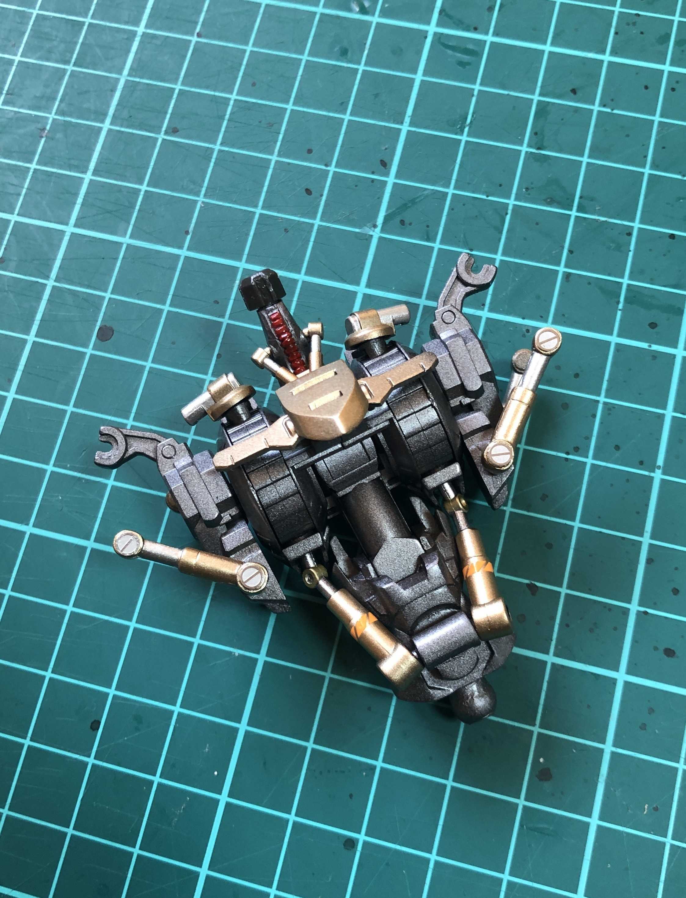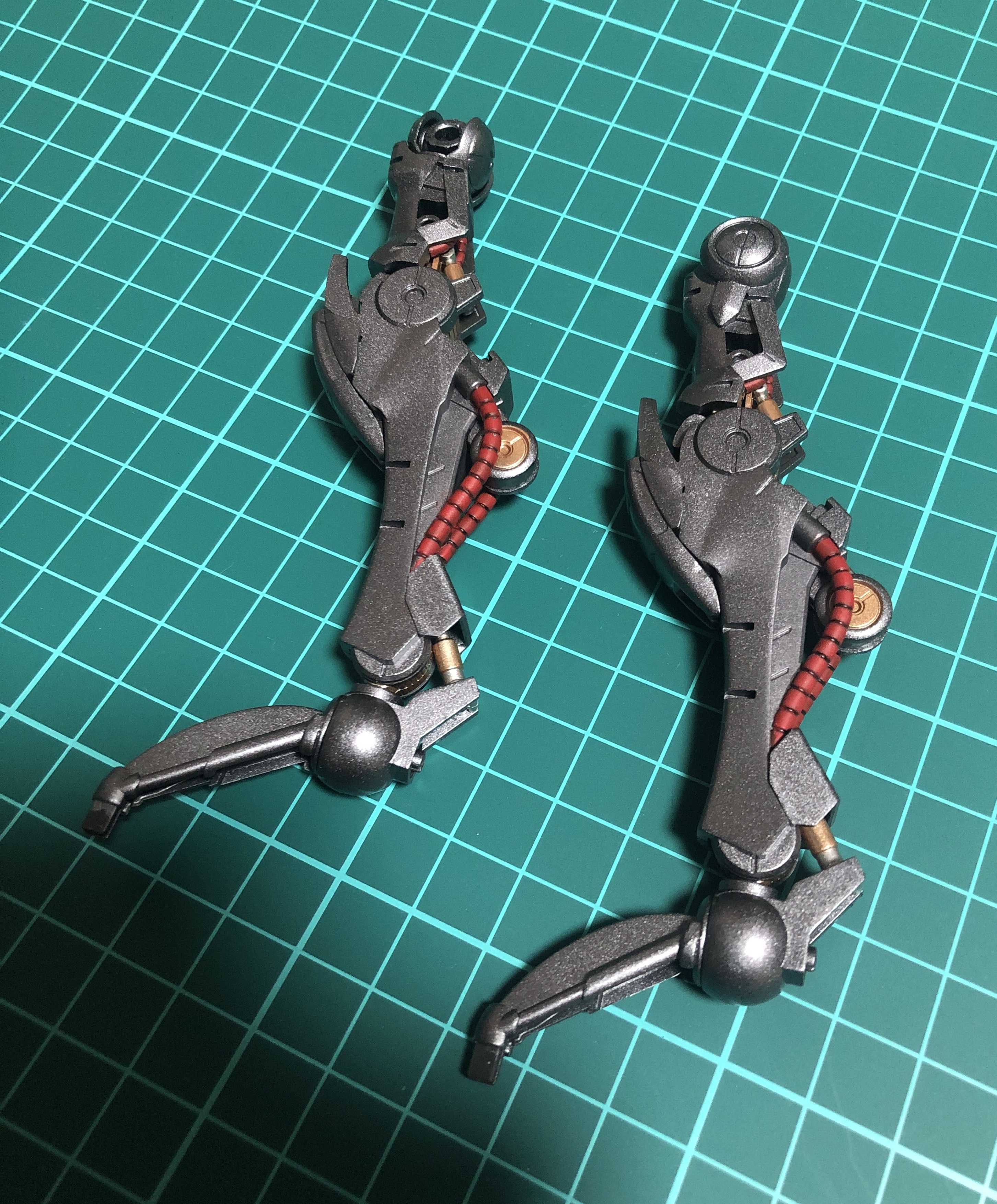 全体マッチョになった為にスネ部分も少し大型化しました。ジャンクパーツを取り付け隙間が空いていたのでダンパーを埋め込みしスジボリ追加後に塗り分けスネがボリュームアップしたのでノッペリした感じだったので逆に爪をシャープにしてバランスを取っ手みました。