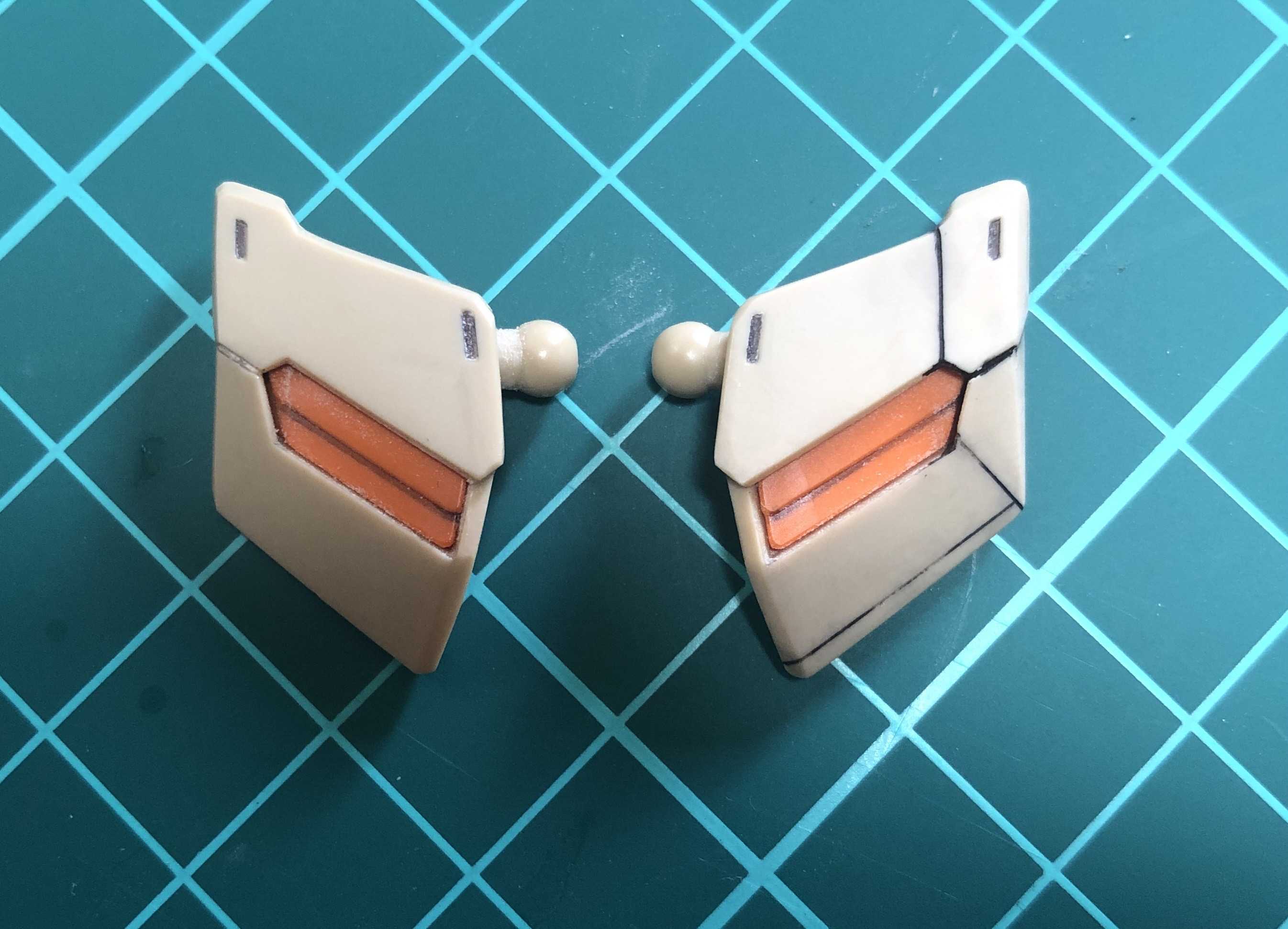 最初に全体的にエッジの部分を全てヤスリで尖らせ気味にしてから・・・肩の丸部分が寂しかったのでスジボリをしました。シャープペンでなんとなく印をしてからスジボリテープで地道にスジボリ開始します。おー!なんとなくいいかも??ついでに六角部分にプラ板でディティールアップもしてみました。さらに台形パーツをプラ板で切り出してつけゴツめに🙋♂️あまりやりすぎてしまうとなのでこの位で辞めないと肩だけ派手になってしまうような(笑)