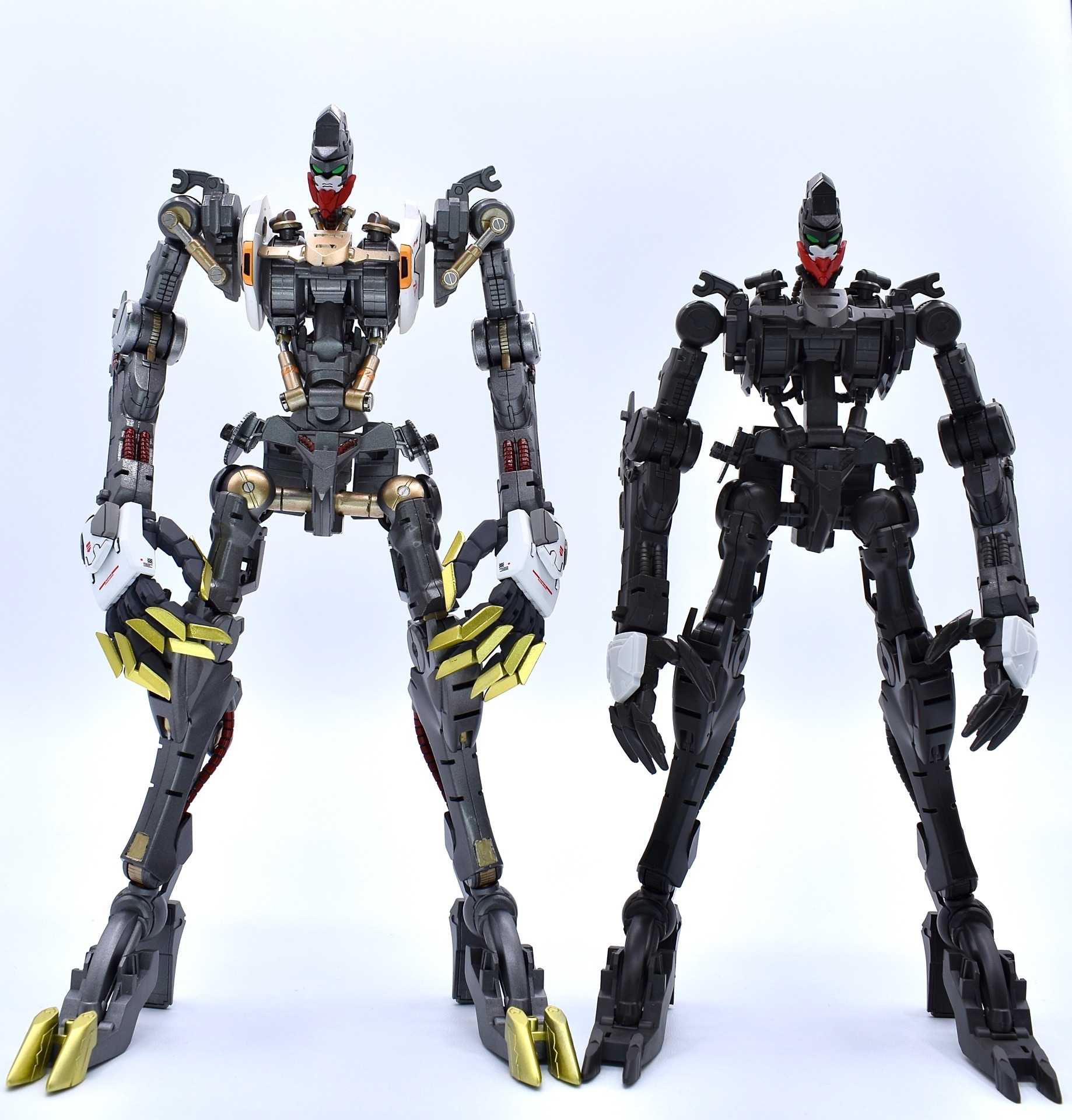 手はかなり大型化。肩シリンダー4本追加し、肩の位置を上にし幅も延長した位置になっています。肩位置変わったのでマニピュレーターの大型化も違和感がなくなりました。今回は爪の造形が社外品でリッチです🤑腰と腰のシリンダーは延長し、中央はプラパーツでディテールアップしました。パイプ、シリンダーなどエアブラシにて塗り分け後、メタルパーツを取り付けました。獣感が増すように爪先の足はフレームをカットし、シャープで細いタイプに変更。手とバランスが合うようにしました。ノーマルと比較写真です。背もかなり高くなりマッチョになったのでかなり大型に変わりました。ただ、シリンダーがあるのでポージングに若干規制がかかりますがプロポーション重視なので大満足🙋♂️