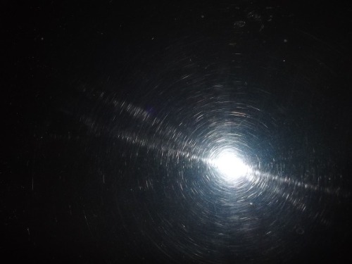 光軸調整の続きです。壁と垂直に車をとめて、ライトを点灯してみます。 壁から1mほど離れてます。 光は中心に明るい部分があり、周辺に向けてぼやけています。 中心の明るい部分は、明確に明暗の差があるので、光軸を調整する頼りはそれによって行えます。「明るい部分の左上の角」みたいに決めて、壁にしるしをつけ、調整ダイヤル(前回の記事参照をぐりぐりまわして調整します。 このとき何回転まわすと何センチぐらいずれるのか会得しておくといいでしょう。下はロービームの写真です。この下は、ハイビーム。実は光軸調整を調べていてわかったことなのですが、フィットはハイビームだと光が拡散してしまい、光軸検査に落ちるというのです。 だからロービームでやるそうです。 確かにハイビームの方がぼんやりしているような・・・画像をいじって解析しました。 明度を下げて、コントラストを上げています。 これはロービーム。 そしてこちらがハイビーム。集中度はロービームのように見えますね。