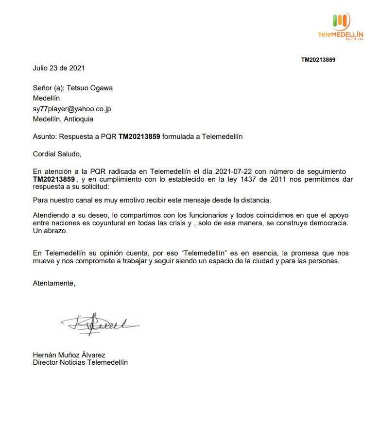 その文章ですが、世界諸国のメディアに送ったのです。そしたらなんと、コロンビアの放送局  Telemedellin  社からPDFファイルにして手紙を戴くことができました。