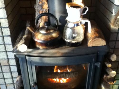 薪ストーブの上でお湯を沸かす。といってもお湯はボコボコ沸騰しない。100℃未満を保っている。薪ストーブ上は100℃前後だから。このお湯、不思議と重厚な味わい。お白湯常飲の私の正直な感想だ。そこへドリッパーとサーバーを置きコーヒーを淹れる。本日はトラジャスペシャル。お湯だけでも美味しいのにさらにトラジャ。ああ、本当に美味しいです。保温もでき読書しながらのコーヒー。至福の土曜日の朝である。