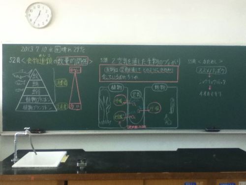 定規も使わず貼り物もなし。3色の白墨(チョーク)だけで板書するのが私の流儀。