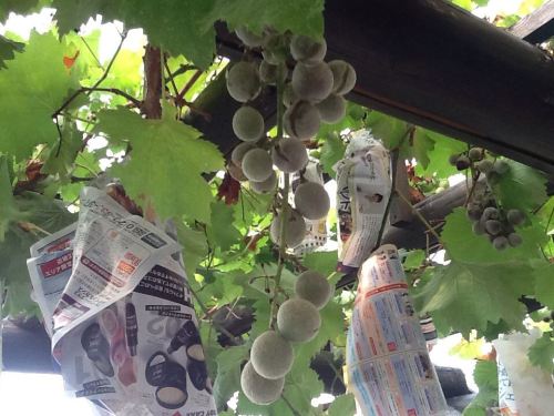 朝方、激しく叫ぶ雀の鳴き声で目が覚めた。雀除けの洗濯物はある程度効果があったが、この時間それらはもうない。朝の洗濯にはまだ時間があるのだ。それに雀除けの洗濯物は娘たちには不評であった。・ホラー映画のようでコワイ。・葡萄棚に近く虫がつきそうでイヤ。・高いところなので洗濯物を取り込みにくい。そこで次善策を考えた。面倒だが一房ずつ袋で包もう。そう決心し行動した。不要になった新聞広告や雑誌などの紙で良さそうな葡萄の房全体を包んでホチキスでパチンと留める。面倒だと思った作業であったが意外と簡単にできた。案ずるより産むが易し。色づいた葡萄は収穫する。残りは雀たちにやってもいいだろう。