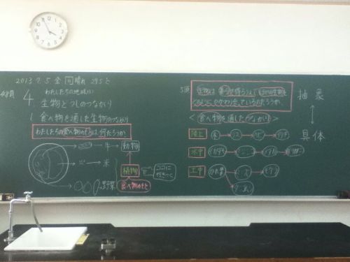 授業が終わると板書を消す。以前は子どもに消させていた。黒板当番ですね。しかし今は私が消している。きれいにした黒板拭き2つに気持ちと力を込める。そうして黒板の上の方から横方向に移動しながら板書を消す。短時間で効果的に消せるのだ。消した後は黒板拭きを叩いてきれいにし再び黒板拭きを今度は下から横移動。その後もちろん黒板拭きを叩いてきれいにする。5分もかからないこの作業を終えて次の授業の用意。黒板がきれいだと板書もきれいにしようという気持ちが高まる。すると子どもたちにもいい影響があるようだ。姿勢も良くなる。帳面もきれいに書くようにもなる。黒板はいつもきれいにしておこう。