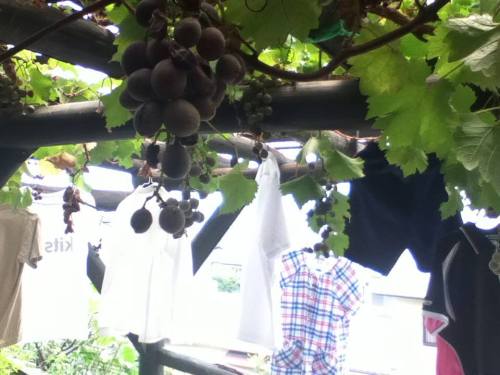 今年も庭の葡萄棚にたくさんの実がなっている。その多くは黄緑色で所々に熟した赤紫色や紺色を見かける。8月以降に順次食べていこう。そう思っていたが問題が発生した。雀である。5、6羽の雀が激しく叫び動き回り葡萄の実を突つくのだ。それも熟した赤紫や紺。去年までは雀蜂が2、3匹、数個の実をほじくる程度であったから大らかな気持ちで眺めていた。しかし今年は雀蜂ではなく正真正銘の雀だ。ふつうスズメよりスズメバチのほうがコワイけど。私が庭に出ると雀たちは一目散で逃げる。雀がいない庭で私は葡萄棚を眺めつつ対策を考えていた。どうしたものか。田圃(たんぼ)や畑で雀除けに日光を反射するキラキラテープやCDが揺られているのを見た覚えがある。キラキラテープやCDがあればいいのだが生憎いまはない。代わりに何かないだろうか。庭を見渡す。おお、これだ!私が目をつけたのは洗濯物。すぐ洗濯物を葡萄棚にぶら下げた。風で適度に揺れて何だか生きているみたい。後で聞いたが長女はホラー映画みたいと言ってコワイと言った。これなら雀も警戒して葡萄棚には近づくまい。葡萄と洗濯物がぶら下がる葡萄棚を私は満足気に眺めていた。