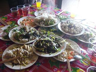 商丘で新年を迎えた日は、朝ごはんを食べた後、他の学生の家に向かった。 その学生が、家族や近所の人たちに、 「私の日本人の先生が来る」と宣伝して回ったのだそうだ。 そのせいか、彼女の家の周りには、初めて来る日本人を一目見ようと、 近所の人がたくさん集まっていた。 「日本人は箸を使えるのか?」「座ってご飯を食べるのか?」「春節はどう過ごすのか?」 など、次々に質問が来る。 それほど、日本人の日常はほとんど知られていない。 同様に、中国人の日常を知っている日本人もほとんどいない。 農村の生活は決して豊かでもなく、便利さなどとは程遠い。 広大な土地の中で、上水道や下水道も完備されていない。 だが、農村を訪ねるたびにいつも思うのは、便利さと家族の幸せとは別だということだ。 家族のみんなはいつも笑顔で、結びつきが強く、お互いに協力し合って生きている。 子供たちはいつも親のことを考え、親は子供のことを案じている。 私が中国の農村を好きなのは、誰もが底抜けに明るく、飾らず、親切だからだ。 二人目の学生の家に行った時も、盛大な歓待を受けた。 初めに6皿ぐらい出てきて、それを食べていると、 次から次へと、新しい料理が出てくる。 食べても食べても、目の前には新しい皿が置かれる。 上の写真の料理を食べた後で、「正式」な食事が始まると聞いた時はさすがに驚いた。 すべて私という客を迎えるために、お母さんが一生懸命に腕を奮ってくれた料理だ。 彼女の家を辞去する前に、家族や友達と一緒に記念撮影。 みんな笑顔だ。 彼女の家族といえば、この方たちも忘れてはいけない。