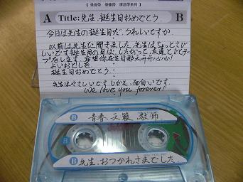 1か月ぐらい前の冬休みが始まる前のこと。 夜10時過ぎに、学生が部屋にやってきた。 聞けば、私にプレゼントがあるという。 私の誕生日は冬休みの真っ最中で、学生たちは皆、故郷に帰っている。 私の誕生日を一緒に祝うことができないので、私が寂しいだろうと心配して、 誕生日に聞くようにと、テープを作ってくれたのだ。 一人ひとりが、私の誕生日を祝福する言葉や、私に対するお礼などを、 ある者はたどたどしい日本語で、またある者は思いのほか流暢な日本語で、 順番に吹き込み、途中に、笑い声が入ったり、急かす声が混じったりしている。 そして、最後に全員で「Happy Birthday」の歌を合唱してくれている。 テープには、「今日は先生の誕生日だ。嬉しいですか?」「先生はやさしいです。しかも面白いです」「We love you forever」 などと書いてある。 このテープに吹き込まれた学生たちの日本語を、部屋で一人で聞きながら、 爆笑したり、時にジーンと感動したり……。 後期が早く始まらないかなあ!