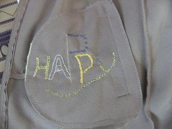 先日、着ていたウィンドブレーカーが破れた。 それを見た学生たちが、「先生、私が直します」と言って、それを寮に持ち帰り、 今日、直し終わったものを届けてくれた。 学生たちが妙に笑っているので、理由を聞いたところ、 破れていたところを直すのとは別に、自分たちで、裏地に勝手に刺繍をしていたようだ。 その刺繍が、これ。 「HAPPY」という5文字。 寮で、1人が1文字ずつ、縫ったのだという。 「この字は私」「私はAを縫いました」「私はPです」などと、嬉しそうだった。 しかし、一番、嬉しかったのは、たっぱり私です!