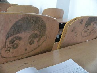 『日本語スピーチ・コンテスト』の予選が終わりました。 4つの教室に、22人ずつ分かれて、予選が行なわれ、 それぞれの教室の優秀者、上位3人が、明日(つーか、もう「今日」だけど)の 決勝大会に進みます。 その模様はまた後日、報告するとして、 コンテストが終わった後、それぞれのクラスでスピーチをした学生たちが、 私のところに集まってきて、取り囲んでくれました。 会場だった教室から、私の部屋まで、彼女たちと一緒にお喋りをしながら、 ゆっくり歩いて帰りました。 思えば、彼女らが1年生の時から、ずっと一緒に頑張ってきました。 今回のコンテストの前、原稿の添削、指導、会話の相手、授業の準備、そして授業と、 絶えず何かに追いまくられている日がずっと続いて、 疲れ果てていた時、彼女たちが、私の体を心配して、 随分と気を使ってくれました。 今では、誰にも負けない、誰にも真似のできない、しっかりとした絆が、 私と学生たちの間には「ある!」と実感しながら、歩いていました。 教師と学生という関係ではなく、 また日本人だ中国人だなどという意識もなく、 人間と人間として、お互いに欠かせない存在になった。 そんな感じがします。 ところで、教室の中で、こんなものを見つけました。 絵は上手いけど、この時の授業、きっとつまらなかったんだろうな(笑)。