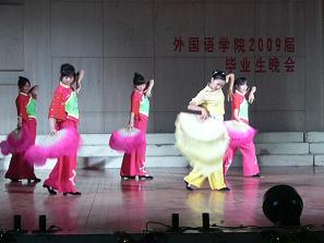 昨夜は外国語学部の4年生たちによる『卒業パーティ』が開かれた。 中国では9月からが新年度だから、この時期が卒業シーズンになる。 卒業パーティを見るのは今年が3回目。 今年の卒業生たちは、去年、彼女らが3年生の時に「会話」と「作文」を担当した。 それ以前、2年生の時は授業をしたことはなかったが、 「日本語島」などの課外活動を通じて、多くの学生と交流があったし、 今年も、担当ではないが、多くの学生が部屋に遊びに来てくれた。 自分が担当しているクラスや学年の学生と交流することは大事だ。 中国の学生と日本の学生は、どこが違うか、とよく質問されるが、 勉強の面では、中国の学生たちは非常に熱心、真剣だということ。 これは多分、日本の比ではない。 生活の面では、中国ではほとんどが寮生活だということ。 1年生の時から卒業するまで4年間、寮の同じ部屋で8人が寝起きしている。 だからお互いのことを理解し合って、友情が深まり、連帯感が強くなる。 その点では、「卒業」に対する感慨も、日本より強いはずだ。 これまでの2回、卒業パーティを見て泣きそうになったことはないが、 昨夜はステージを見ていて、涙が出そうになった。 学生たち一人ひとりに対する思い出が多くて、時の速さも同時に感じてしまった。 今年の卒業生は、世界的な経済不況のせいで、とても苦労している。 就職がままならないことから、院生への進学を目指す者が多くて、 院生試験の競争率が高騰し、非常に狭き門になった。 院生試験に失敗して、仕事を探すにも、職がなかなか見つからない。 学生たちのそんな苦労を聞いていたことも、 涙が出そうになった理由かもしれない。 卒業生たちは、たくさんの学生が私を慕ってくれた。 私も彼ら、彼女らに会えば、気持ちが明るくなった。 卒業後の社会では、困難や失敗は必ずあるだろうが、 持ち前の明るさで、挫けることなく、自分の道を歩んでほしい。 ありがとう! 私はあなたたちに会えて、とても嬉しかった。 あなたたちとやった授業は、私の心の財産です。 またいつか、中国か日本のどこかで会いましょう! 扇子を使った舞踊。 こういうのが実に中国らしい。 踊っているのは、私のクラスの1年生たち。 中国の伝統楽器の演奏。 済んだ音色で、心が洗われるような気がする。 ウクライナから赴任している教師と学生によるロシア語の歌の披露。 右側の女性がウクライナ人で、旦那さんも、この大学のピアノ教師。 こちらは韓国語の歌。 外国語学部だけあって、この日はロシア語、韓国語、フランス語、英語、 そして勿論、日本語と、異国の言葉が飛び交っていた。 場内の爆笑を誘っていた寸劇。 こういうのを見て、2年生の日本語発表会でミニ・ドラマを採用することにした。 日本語学部4年生の有志たちによる合唱「夢をあきらめないで」。 去年の会話の授業に教えた歌だが、それをこういう場で合唱してくれたことに感謝。 そして場内が感涙にむせんだフィナーレ。 この他にもたくさんのプログラムがあり、 7時半から10時半までの3時間、素晴らしいパーティでした。