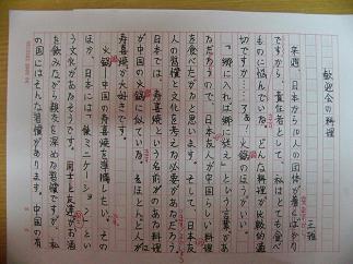 今年、私が担当している授業は1年生の「発音(会話)」が3クラス、 2年生の「作文」が3クラス、そして2年生の「会話」が1クラスという構成。 その「作文」の授業で、3年前からずっと続けていることがある。 それは学生の作文を添削して返す時に、3点セットで返すということだ。 まず、1つ目は学生の作文の単語と文法の間違いを赤いペンで直すということ。 これは学生自身に間違いを気づいてもらい、正しい単語と文法を覚えてもらうためのもの。 私だけでなく、ほとんどの先生がやっていらっしゃることだ。 私だけがやっていると思うのは、次のこと。 これは学生の作文を全面的に書き直したもの。 特に、作文の構成を覚えてもらうためのもので、 論旨の「転」と、自分が何を言いたいかという「結」の書き方を知ってもらうために、 学生が書いていないことを書き加えたり、順番を入れ替えたり、 或いは日本語らしい言葉遣いを使って、学生の作文を書き直している。 そして3点目は、学生と同じテーマで私が書いた、いわば「模範作文」。 自分の作文と私が書いた作文を読み比べてもらって、 テーマの捉え方や、論旨の進め方、発想法、日本語の使い方などを 覚えてもらおうというもの。 この3点セットで学生に作文を返却するというのは、3年前からずっとやっている。 この他にも、全員の間違いを1枚の用紙に集めて、それをコピーして学生に配り、 全員で間違いを直すという授業もやっている。 これは、他の人の間違いを一緒に直すことで、クラス全体でレベルを挙げるための方法。 今年の2年生は120人いるので、その全員の作文を添削し、更に書き直すというのは、 実は相当な時間がかかる。 日中と夜は、学生たちがひっきりなしに私の部屋に来るので、 作文を直す時間を見つけるのも、けっこう大変。 作文を書かせた週は、寝る時間を削ったりして、私も時間の工面に追われることになる。 それでも、これまでずっとやってきたことだし、 去年105人の学生を相手にできたことは、今年120人の学生を相手でもできるだろう。 大事なことは、教師が手間と時間を惜しんだら、 それは学生にすぐにわかるということ。 手間と時間をかければ、学生たちの能力が必ず向上するというわけではないが、 手間と時間をかけなければ、学生の能力を向上させることは難しい。 学生の能力を向上させるために、自分ができることは全部やるというのが、 教師の義務だと思う。 何より、学生たちの日本語が上手になれば、 日本語教師にとって、それに勝る喜びはないからだ。。。