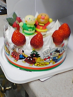 砂糖でできたアンパンマンとメロンパンナちゃんを持ってはニコニコ。