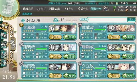 前回屈辱レベルまで大惨敗した夏イベを顧み、まずは戦力の底上げを図ったのです。まずは榛名さんとケッコンカッコカリ素の運が高いのできっと戦力になってくれるでしょう・・・高速艦の活躍の場があればそして待望の待ちに待った新戦力ず~~~~~~~~~っと待ち望んだ瑞鳳さんがついに実装されました。戦力ですが、前回と比較し低速艦と空母を増強なのです。<戦艦>とにもかくにも夏イベではいなかった&戦力外の新造艦であった大和・武蔵の台頭、そしてこそっと育てた長門です。伊勢マルクがいませんが夏のような2艦隊分けとなってもおそらくは何とかなるでしょうただし、航空戦艦は相変わらず・・・・<空母・軽空母>正規空母は戦力要因大幅増強2艦隊に分かれてもへっちゃらです。軽空母は生まれたての瑞鳳ちゃんがこころもとないですがそれ以外はなんとか行けます。<重巡・航巡>いつもの通り弱点一応、熊野を育てましたが焼け石に水次回イベまでには育てよう(毎回恒例宣言)<軽巡・雷巡>雷巡は北上っち2号を追加これで2面作戦でも両方に2隻ずつ出撃可能軽巡はまぁ何となく育ってる<潜水艦>変わってません!まぁ充分でしょ<駆逐艦>今回キーになると噂の駆逐艦まんべんなく育ってます戦況によっては鼠輸送系の高レベル遠征要因も少し戦闘要員に回さなければならないかなぁ物資はこのくらいまぁきっと足りるさ(慢心)そしてそして大和さんとケッコンカッコカリしました