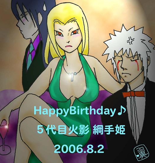 こんばんはw先日自分の過ちから、綱手様画像をすっ飛ばしてしまって落ち込んでいた翼蓮デスw まったく同じ構図は胸が痛いので、もうぶっつけ、行き当たりばったりで・・・資料も見ずに描いたんで、けっこう色が違ったりするかも・・・。 せっせと塗って・・・ちょっと失敗か・・・?と、あせっていたら、後ろで(夜勤明けで)寝ていた旦那が「ん・・・、ヘタウマ絵か・・・?」うぎゃ~~wヒトがうすうす気にし始めていたところを、背後からぐっさり(汗 い・・・いいもん。いいんだもん。とにかく、何か描きたかったんだもん・・・。 では、突っ込みどこ満載のハピバ絵公開・・・??