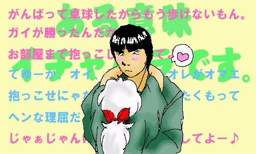 なおりんぐさんから、当選通知が!妄想爆爆で、温泉に行ってきます!! 湯煙温泉~癒しと妄想渦巻く旅~温泉でばったり、キャ☆ごめんなさいバトン ■一緒に温泉に行きたいキャラを3人程あげてください ガイ、リー、テンテン。本当はガイ班のみんなと行きたかったけれど、ネジは他の上忍任務があって欠席。残念!■その中で特に誰と? ガイと■そのメンバーで部屋割りするなら?みんないっしょの部屋で!トランプしたり、ゲームして遊ぶ!修学旅行の夜みたいできっと楽しいはず!■一緒に温泉に入るなら?上記以外複数回答可 もうイルカとは入っちゃったしなぁ(事故です)最初はテンテンと女同士で入って。寝る前とか、深夜にもう一回入るときは、子供達の目を盗んで貸しきり露天風呂に・・・ガイと入っちゃうかなッ☆ ■浴衣が似合うベスト3一位 自来也 もう普段着が甚平とか浴衣っぽい。エロかっこいいしね。二位 ガイ ・・一番は道着が似合うかも♪でも、浴衣も似合うはず★三位 シズネ 自然に着こなしてそう!同性でもドキッとしちゃうかも!(危■温泉卓球白熱バトル!!!自分VS誰?そして勝敗は?ガイvs翼蓮 一回はサシで勝負!!もちろん負けますが、楽しけりゃいい!ガイ&テンテン vs 翼蓮&リー これも白熱するね!!■次の温泉旅行当選者8人→もうみんなまわっちゃったぽいなぁ~~!あ!キバ子さん!キバ子さ~~ん!!温泉行き!当たりましたよ~~!!お時間あるときに、ぜひ、行ってらしてくださいね!!あ・・・余談ですが。こんな妄想かましてました。 もーそー(妄想)かまして、よかですか?↓ ↓誰か私たちをこのまま殺して。(倒錯)