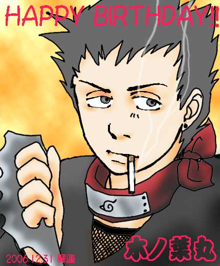 一月はお誕生日さん多いよね~~!皆様は誰をお祝いするの?? * 1日 マイト・ガイ * 2日 たたみイワシ * 8日 日向ヒアシ・ヒザシ * 9日 ハク * 19日 我愛羅 * 23日 油女シノ * 24日 山中いのいち * 25日 四代目火影 一月・・・昔付き合った人が、2人とも同じ生年月日だったのにはひいたね・・・。みずがめ座の男には弱いのです あ、もう、今はガイにメロメロですが。