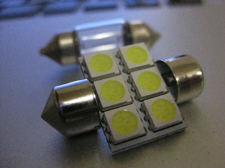 先日購入したルームライトが届きました。奥の方が純正。後輩がドライブやパチンコに行こうって悪い誘いをするので、なかなか取り付ける事ができず、しばらく放置していましたが、今日の午後に取り付けてみました。カバーはマイナスドライバーで外しましたが、意外と外れにくかったですね。というか、LED6発だとさすがに光量が物足りない感じもするので微妙かなあ?あまり明るすぎるのも嫌だけど、もうちょっと明るくてもいいので、そのうち替えようかな...まあ、以前よりは明るくなっているし、バッテリーの負荷も減ったので、当面はこれでよしとするかな〜。ルーム球 T10-31mm 6LED 3Chip ホワイト 2個セット 0023-2