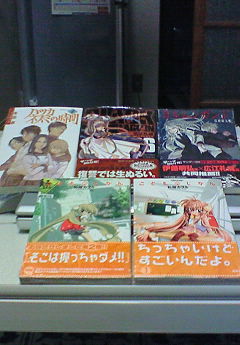 しながら本屋を転々として買ってきました。↓↓↓↓↓昨日今日はこれ読んでたんでこれの感想あたりを書こうと思う。ハツカネズミの時間(左上)この絵は好きなんですよね。話の内容も悪くない。俺から見たら面白い、のに、この本は2005年の5月から本屋に並びっぱなしだったみたい。なぜ?ブラックラグーン(中上)この巻のロベルタがかっこよすぎる。マジでかっこいい。他の話はアニメで先に出てたからあんま新鮮味がなかったけどとりあえずロベルタがかっこよすぎな巻でした。ヨルムンガンド(右上)こいつは元少年兵が主人公。絵もいい感じだし他のキャラもいい働きしてる。ココとかの変化もいいね。こどものじかん(下段)タイトルと表紙の割には中身は結構シリアスだぜぃ。特に二巻とかな。何回か読み直していくといろんなところでのつながりとか見えてくるし。俺も小学校の先生にnしかし現実とはかくも非常なのだよorzあとはプ~ねことらき☆すただけだな。さぁてよむかぁ~~~~~~~~~~~~。では。