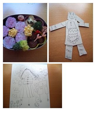 design++dalu++●●*●●*●●*●●*●●毎日少しずつ暖かくなっていっているような気がしますこのまま春にぃーっとはいきませんよね?娘の幼稚園の発表会ももうすぐなんで、風邪をひかさないようにっと気合です今日のお弁当はおにぎりでお花そして、右奥にうずらたまごのくまさん見えます???最近買った”ホームスウィートクラフト”にお弁当が載っていて、真似っこしてみました手芸の本【ヴォーグ社】ホームスウィートクラフト最近、娘の描く絵がおかしくって。。。会話がそえられていたりするのです男の子”ねぇお手手つなごうよ”女の子”えっわたしそんなはずかしいことできない”とか。。。右のは、人型に切り貼りしてあります。これ、私らしいです。。。そして、教室で習ってきた”タルトレット・オ・ノワ”タルト生地の上にくるみを混ぜたアパレイユ、上にカシューナッツ、ピーカンナッツ、松の実、かぼちゃの種を乗せてます。ナッツ好きの私にはたまらなくおいしいタルトでしたちなみに下のタルト生地はお砂糖が入らないパイ系の生地です。●●*●●*●●*●●*●●