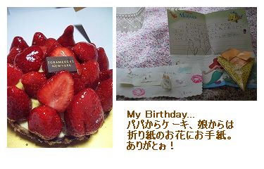 design++dalu++●●*●●*●●*●●*●●恥ずかしながら。。。昨日は私の誕生日でしたそろそろ、大台に近づいてきて、中身も近づいていってるのかどきどきです。去年は、パパとディナーデートの予定が、当日パパインフルエンザでキャンセル。。。っと、なんだかぁーな一日でした今年は、、、四月一日生まれの娘のお友達のおうちにおよばれして、一緒にお祝いしてもらっちゃいましたお友達ママの心遣いに大感謝っパパもケーキを買って少し早く帰ってきてくれ、娘からは折り紙のお花とお手紙、大切にしているプリキュアのシールもらいました。お手紙には。。。 おたんじょうびおめでとう いつもごはんつくってくれてありがとう いつもたべておいしいよ だからいつまでもおいしいごはんつくってねとあり、大きな大きなケーキの絵が描かれていました素敵な誕生日ありがとぉ!●●*●●*●●*●●*●●