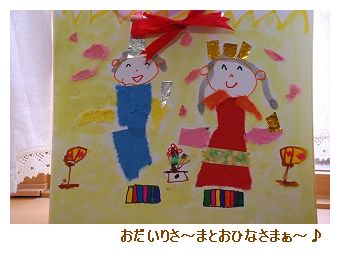 design++dalu++●●*●●*●●*●●*●●♪おだいりさぁまとおひなさまぁ~♪三月三日、ひな祭りですねぇお天気はいまいちですが、気温は少し高いのかな?いつもより一枚少なめの着込み方です。。。上の絵は幼稚園で描いてきた”お内裏様とお雛様”です。なかなかうまく描けてると思いませんか?(←親ばかぁ)どちらもニコニコととても楽しそうですそして、ママ作”お雛様”タイマーをかけていたはずのご飯がたけてなかったり、薄焼き卵がうまく焼けなかったり。。っとのトラブルがあってバタバタでしたが、どうにか出来上がりましたひな祭りのご飯は、はんど&はあとに載っていたチラシ寿司に挑戦しました。ほかは。。。ハマグリのお吸い物、そしてあげなすにからあげ、サラダっ!●●*●●*●●*●●*●●